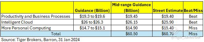 While revenue from the Productivity and Business Processes unit, Intelligent Cloud, and More Personal Computing all exceeded Wall Street estimates, Microsoft's third-quarter mid-range revenue forecast of $60.5 billion falls slightly short of the street estimate of $60.7 billion.