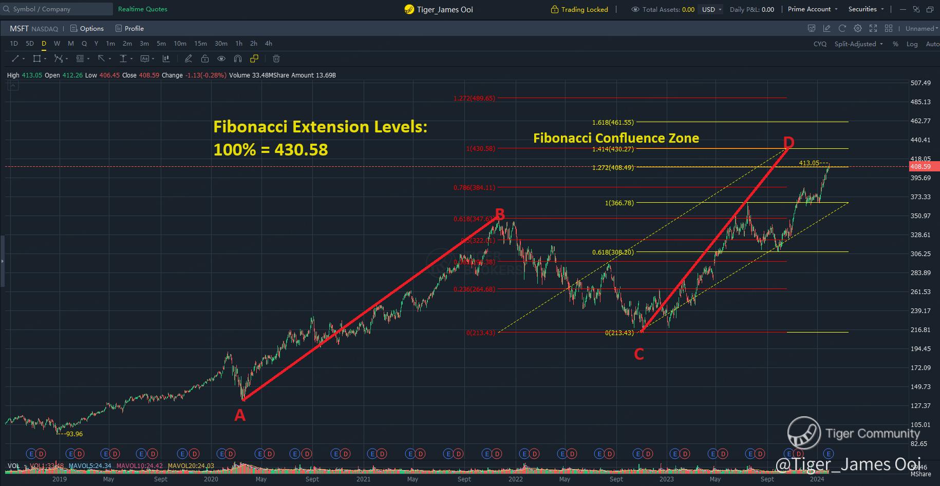 Microsoft stock recently surpassed its 127% Fibonacci expansion level (from the 2022 low to the 2023 July high) of USD 408.49, closing at USD 408.59.