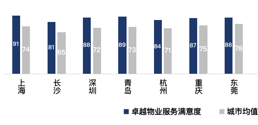 齊頭並進,2023年,卓越商企服務旗下住宅業態卓越物業服務滿意度較2022年持續提升3%,大幅領先行業平均水平(高於賽惟調研行業總體基準值14%),在卓越商企服務重點佈局的城市包括上海、深圳、杭州、重慶等一線和新一線城市遙遙領先。