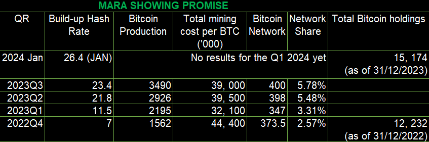 We favor CLSK because CLSK has shown consistent Bitcoin production growth (phenomenal should they hit 50 exahashes/s by Q42024), and network share growth while keeping total cost per Bitcoin in the low $30,000 level. MARA also looks promising for the same reason (see attached picture below), consistent Bitcoin production growth, network share growth, and cost basis. BITF has to show that it can meet its 2024Q2 guidance, while IREN is a strong contender if it begins to HODL Bitcoin.