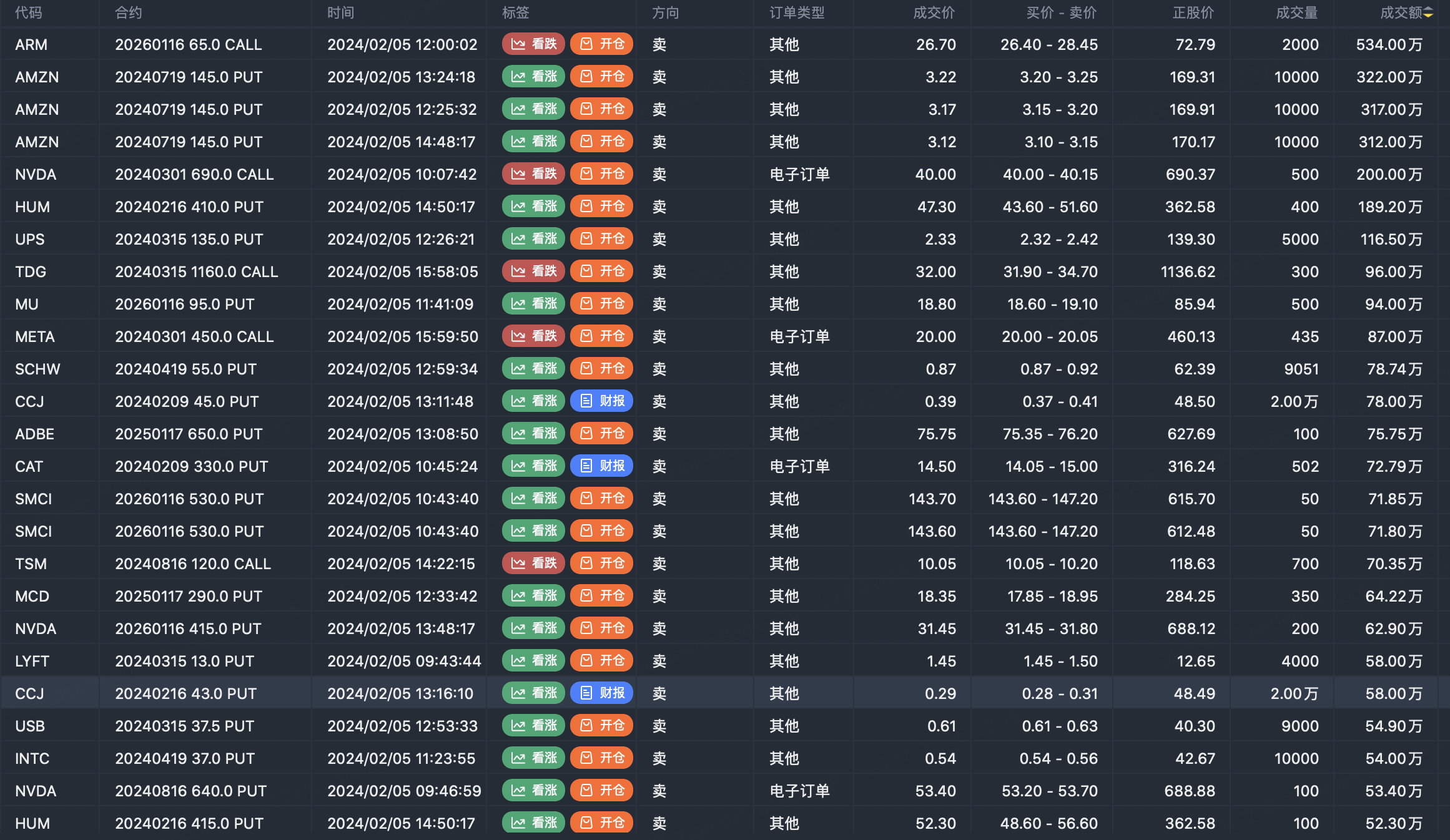 Note: This image data is from Tiger PC. This screen is a significant sell open position for an option contract in the market. A sell of a call option means that the trader believes that the underlying trend has peaked, and a sell of a put option means that the trader believes that the underlying trend has bottomed. These contract openings typically indicate significant activity in the underlying stock, including whether the trader is willing to accumulate a long or short option position.