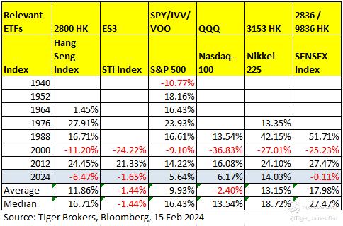 It is also important to note that the S&P 500 underperformed all other indices mentioned above in the last Year of the Dragon, which was 2012. Thus, it might be wise to include some of the Asia Index ETFs in one's portfolio this year.