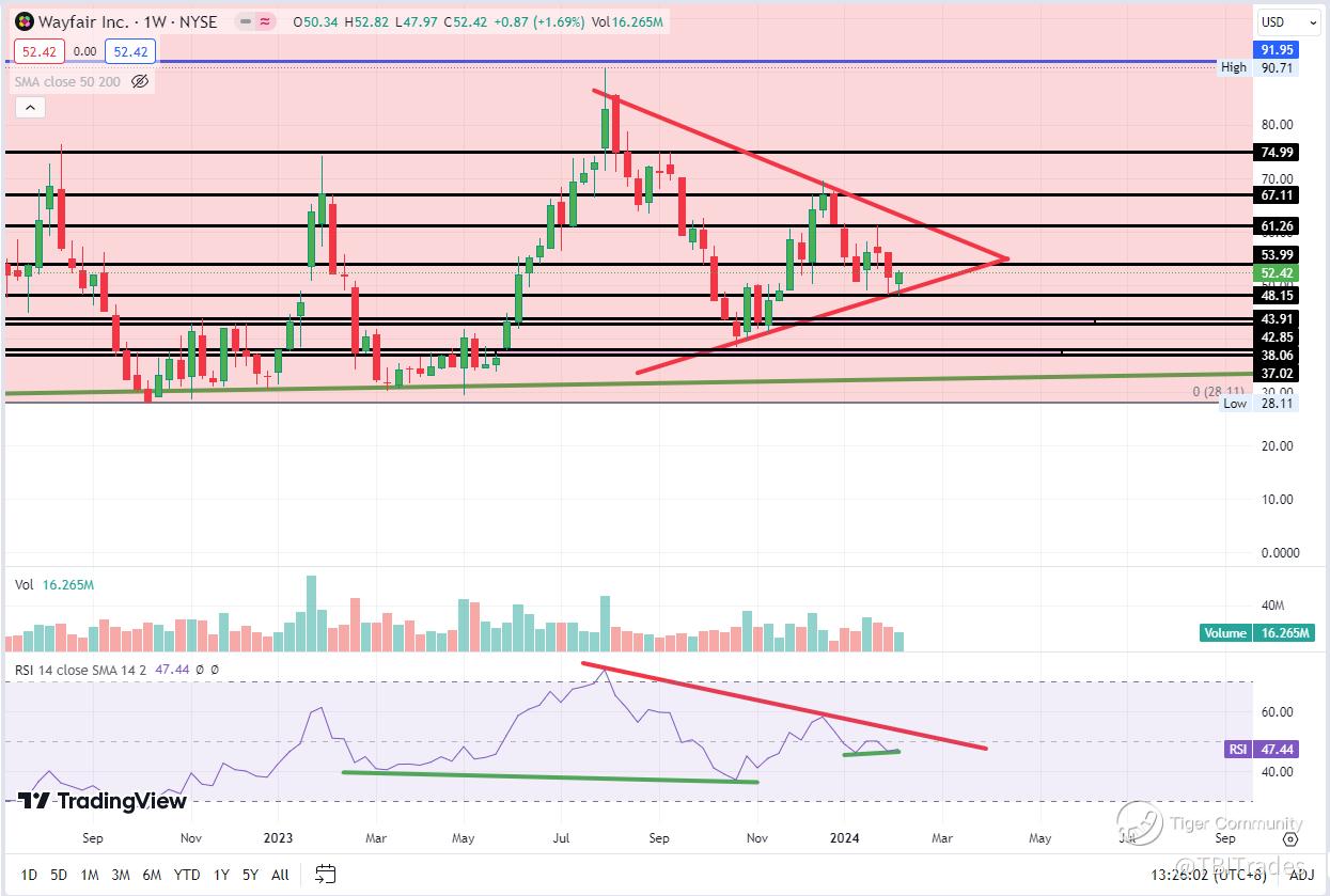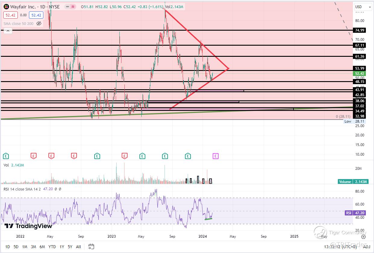 The weekly chart of W shows a consolidation symmetrical triangle pattern with lower highs and higher lows. This is more pronounced and less speculative than the inverse head and shoulder pattern that I had looked at a few weeks ago. A small hidden bullish divergence is forming, which is indicative of an impulsive move higher. RSI is largely following the pattern as well with lower highs and higher lows. Note that volume is decreasing but buyers are steadily accumulating on the way down.