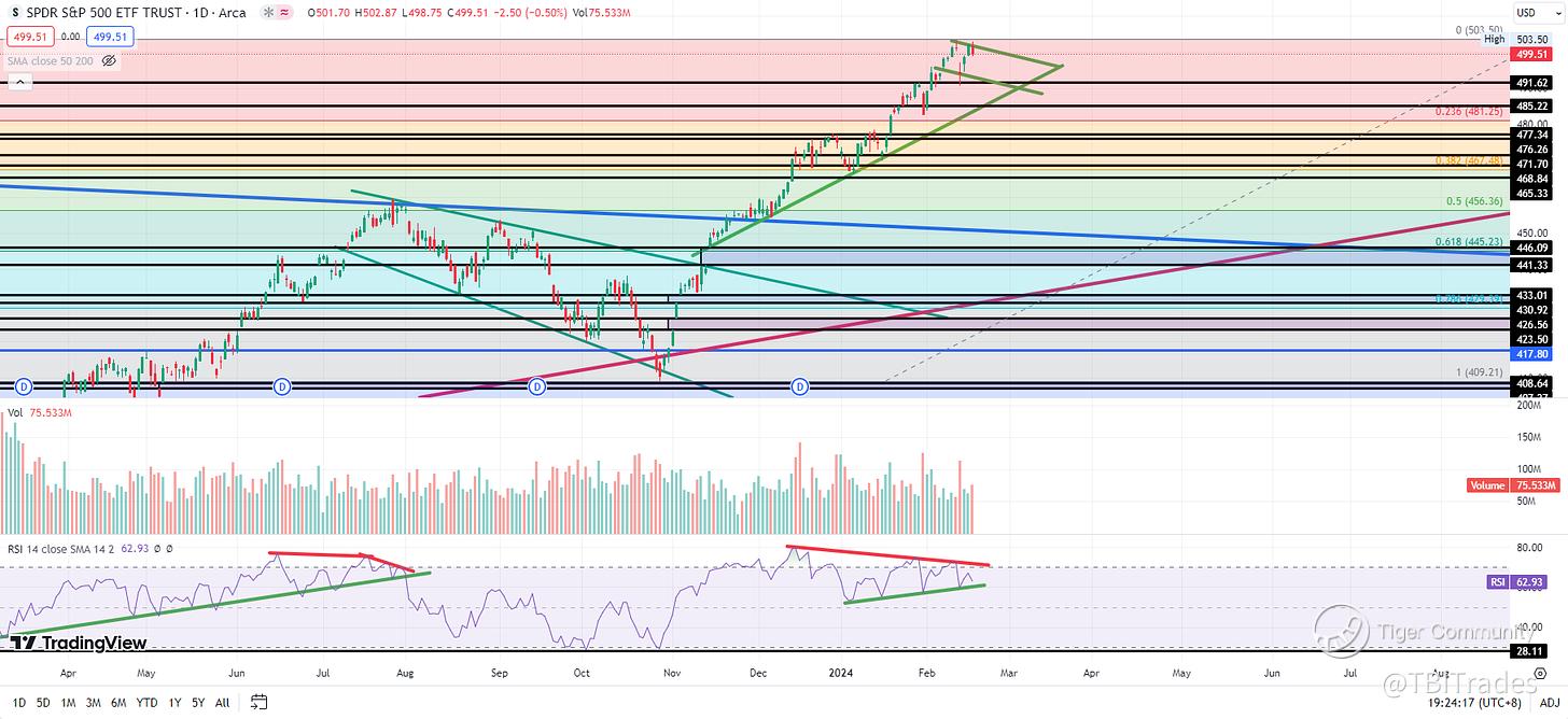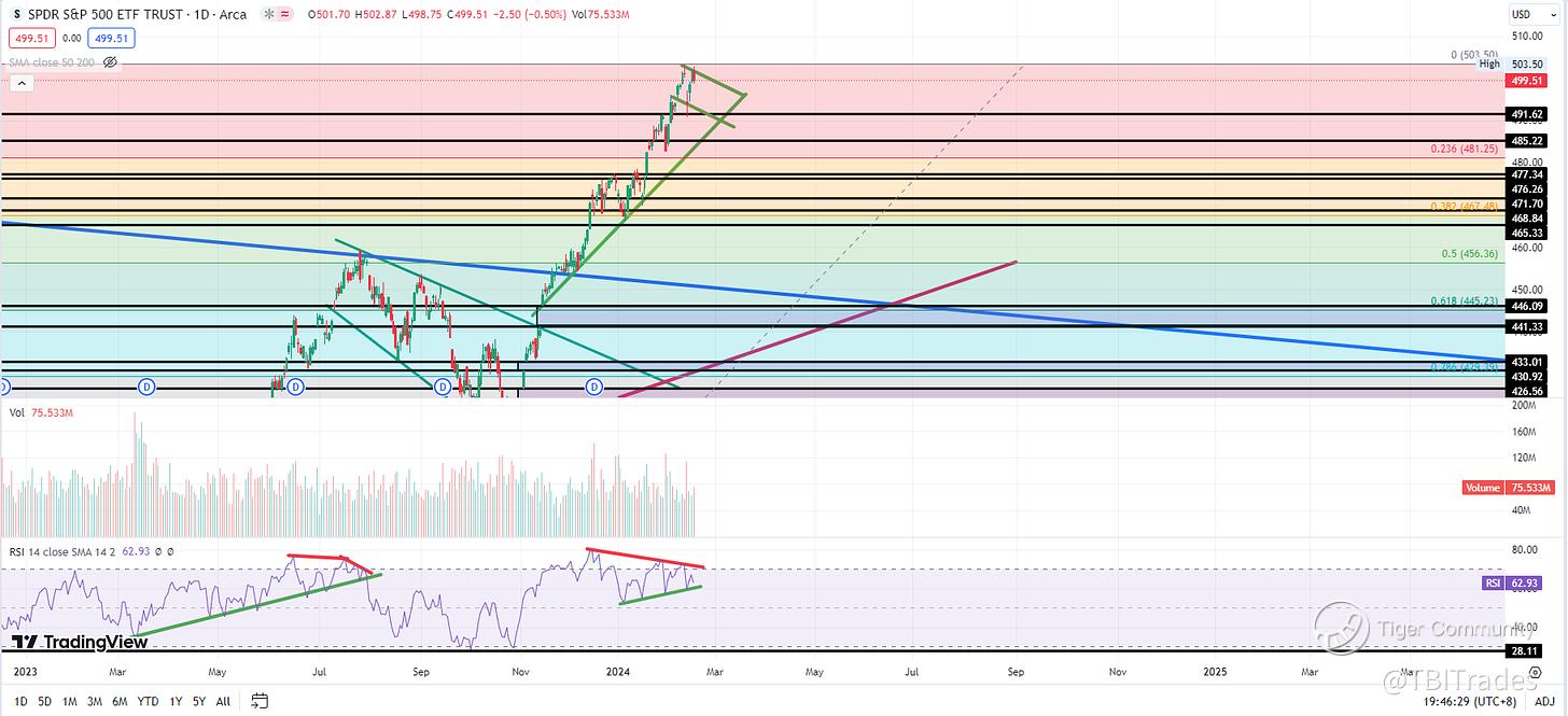 Near-term price action is indicative of a retest of 491, based on the possible consolidation channel it is forming. A breakdown of the higher low ascending trendline (in green) on SPY will trigger a move lower and cause the bearish divergence to play out.