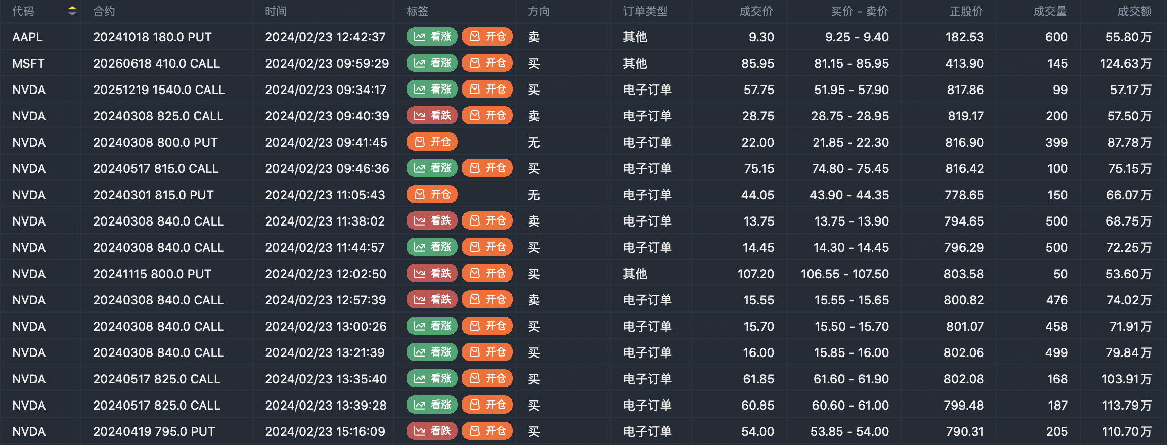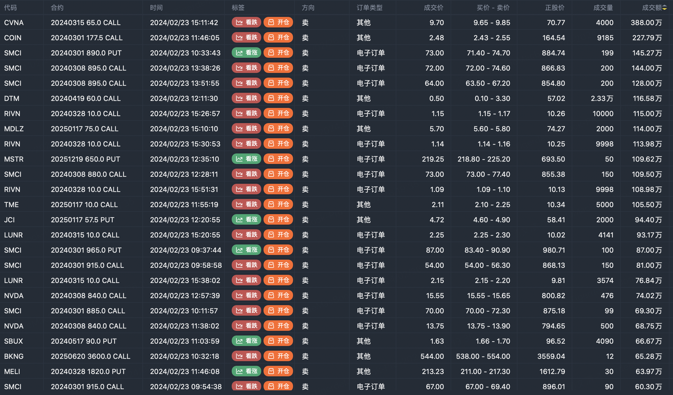 Note: This image data is from Tiger PC. This screen is a significant sell open position for an option contract in the market. A sell of a call option means that the trader believes that the underlying trend has peaked, and a sell of a put option means that the trader believes that the underlying trend has bottomed. These contract openings typically indicate significant activity in the underlying stock, including whether the trader is willing to accumulate a long or short option position.