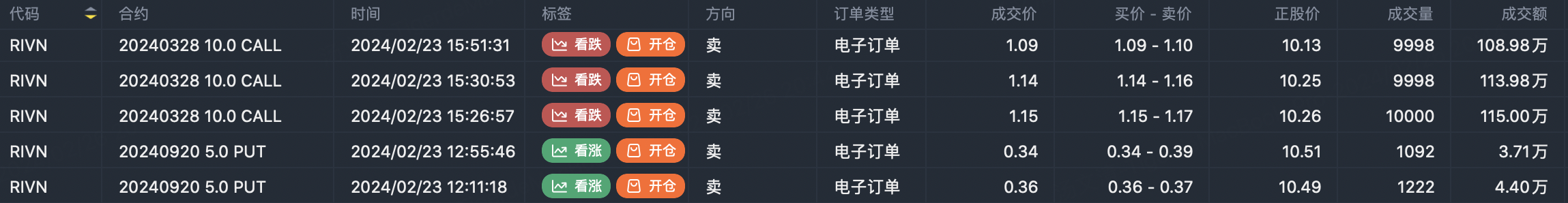 $Rivian Automotive, Inc.(RIVN) reported revenue of $4.434 billion in 2023, up 167% from $1.658 billion in the same period last year. Gross loss was $2.03 billion, compared with a gross loss of $3.123 billion a year ago. And the company announced it was cutting 10% of its workforce because of economic uncertainty. Rivian shares plunged 25.6 percent after the earnings release. Option transactions show heavy selling of call options with a strike price of 10 expiring on March 28 $RIVN 20240328 10.0 CALL$