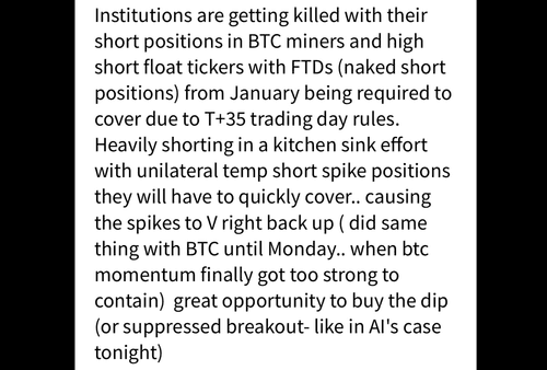 $Marathon Digital Holdings Inc(MARA)$ $C3.ai, Inc.(AI)$ $IONQ Inc.(IONQ)$ $Fisker Inc.(FSR)$ $CleanSpark, Inc.(CLSK)$ $Lemonade, Inc.(LMND)$ These tickers will all be up big the next couple of days... These are BTC miners and High Short float AI stocks that Institutional shorts are stuck upside down in.. so today (and last night with LMND) tried big short spikes to manipulate longs into thinking there was a selloff and throttle momentum for coming short squeezes and big rebounds back up. anyone can temporarily drop the price- short spikes are unilateral transactions involving no actual shares. But the problem for shorts here.. is that there are not many longs selling/ in BTC miners and large short float AI