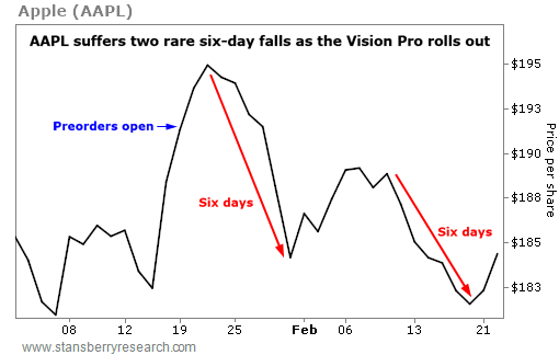 But a rare pattern has emerged in the drawdown. AAPL share prices just fell for six consecutive trading days – twice. Take a look...