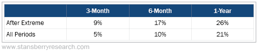 But after six days in the red, its stock does even better. This kind of price action has resulted in an average return of 9% in three months, 17% in six months, and 26% after a year.