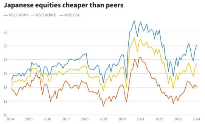 MSCI日本指數的遠期市盈率較低 圖源:路透社