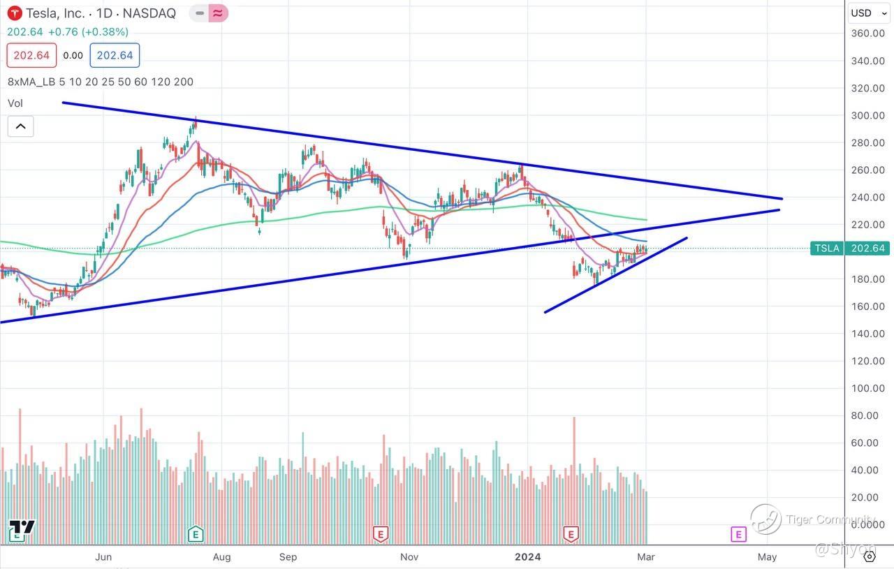 Today, let's look into a few famous EB counters. We will start with the leader, Tesla! The company experienced a pullback since July 2023, forming several lower high and eventually breakdown below the symmetrical triangle pattern. Until recently, the stock price shows some reversal strength by forming a short term uptrend as drawn in the figure below, since end January, closing the gap. At this moment, I believe Tesla $Tesla Motors(TSLA)$