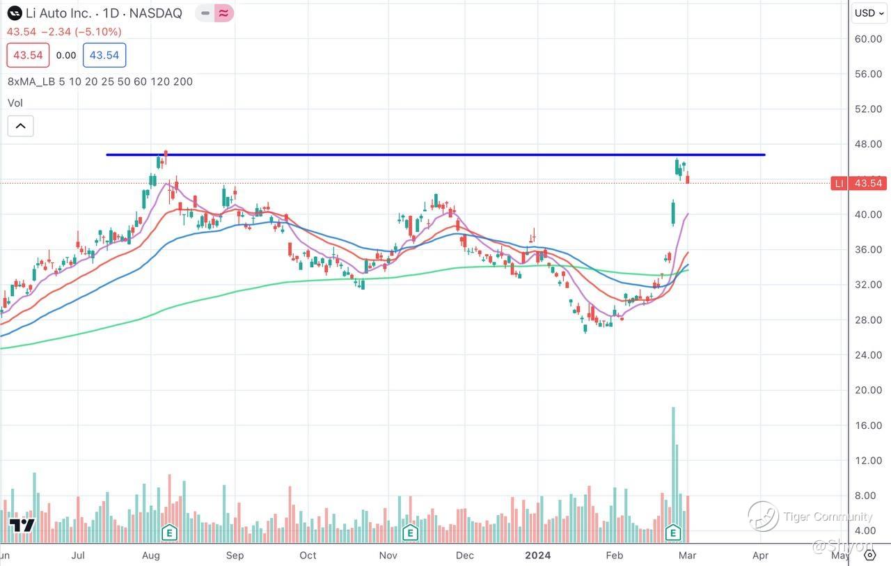 Li, on the other hand, is one of the best performing Chinese EV for the past month, mainly boosted by the outperformed results announced last week. However, the stock is reaching its double top resistance and I expect a short term pullback for Li, therefore a bearish vote for it $Li Auto(LI)$