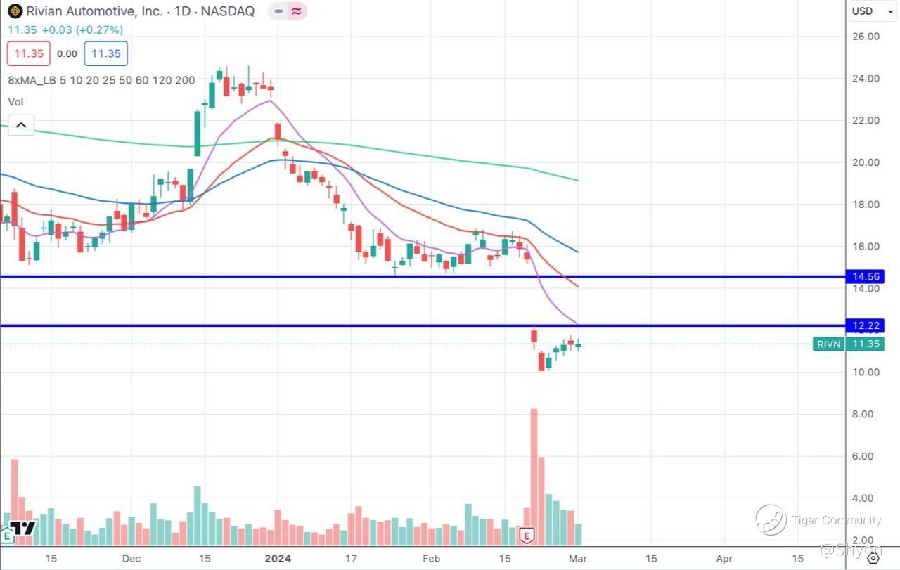 Next, let's look at Rivian. Rivian continued to disappoint its investors two weeks ago after its earnings call. The stock gapped down to below 12 USD with all the critical EMA lines facing downwards. I believe the stock will remain weak $Rivian Automotive, Inc.(RIVN)$