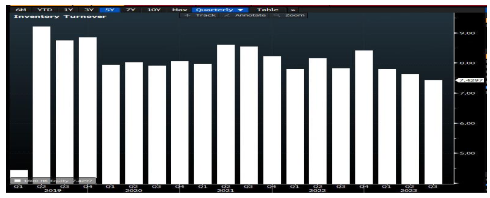 由上圖可知從2019到2023過去五年時間,該公司的存貨周轉率一直在下降,雖數值依舊處在高位,應留意後續該公司的資本運用效率,銷貨速度是否有提高。