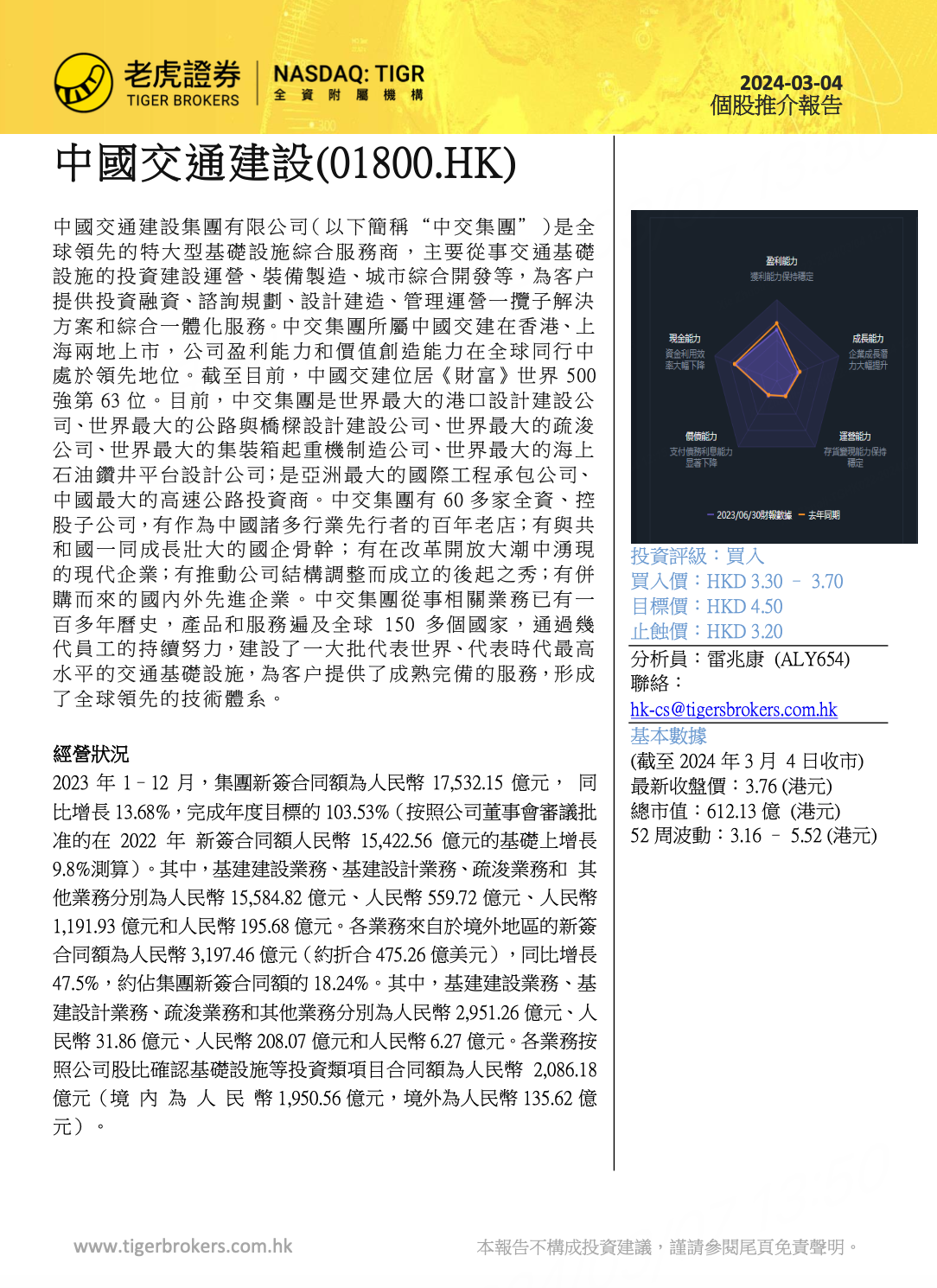 中國交通建設集團有限公司(以下簡稱“中交集團”) $中國交通建設(01800)$ 是全球領先的特大型基礎設施綜合服務商,主要從事交通基礎 設施的投資建設運營、裝備製造、城市綜合開發等,為客戶 提供投資融資、諮詢規劃、設計建造、管理運營一攬子解決 方案和綜合一體化服務。中交集團所屬中國交建在香港、上海兩地上市,公司盈利能力和價值創造能力在全球同行中 處於領先地位。截至目前,中國交建位居《財富》世界 500 強第 63 位。