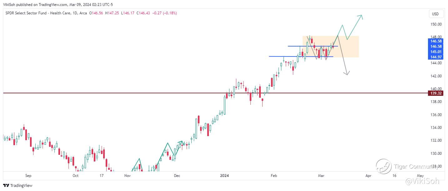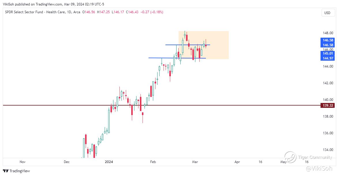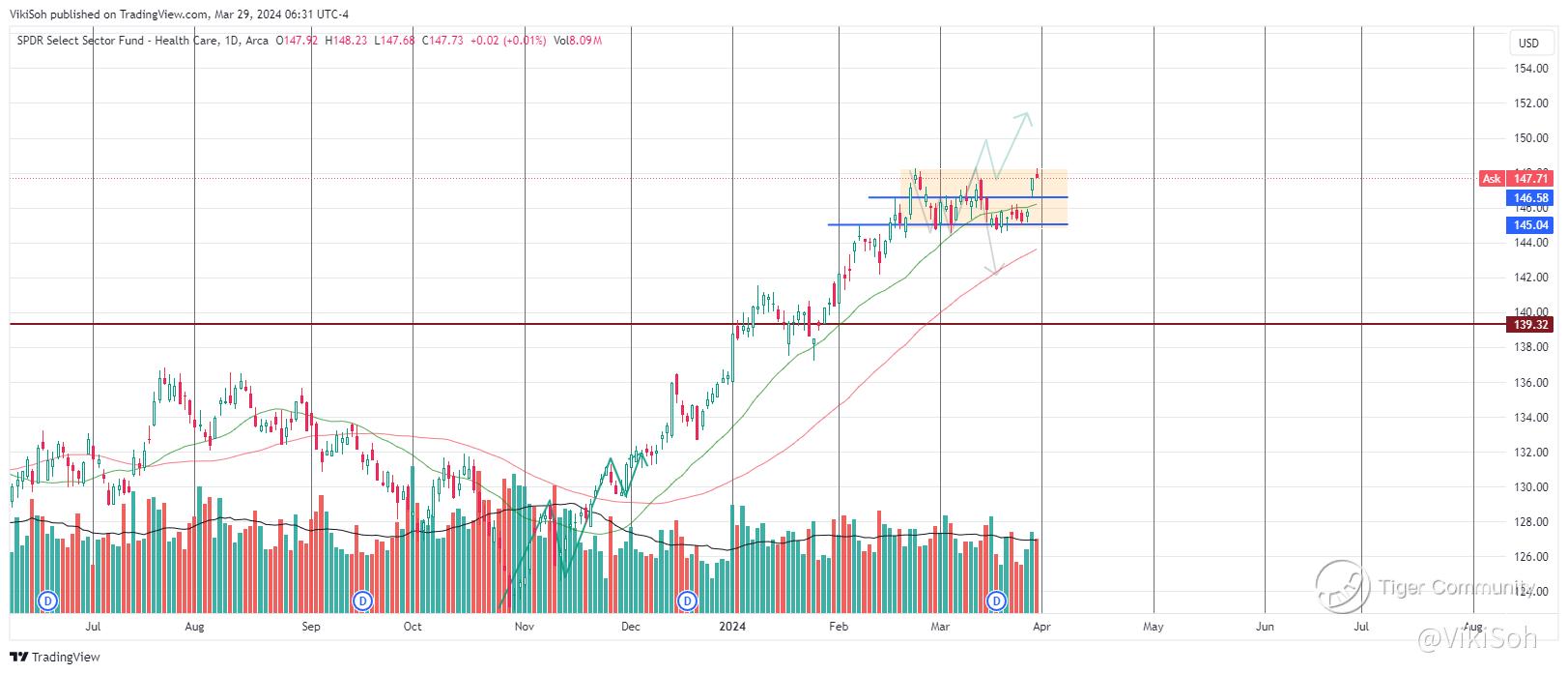 Review technical indicators such as moving averages, support and resistance levels, and chart patterns to identify potential breakout or reversal points. Consider whether XLV's current price range is near key resistance levels that could trigger a breakout or support levels that may lead to a reversal.