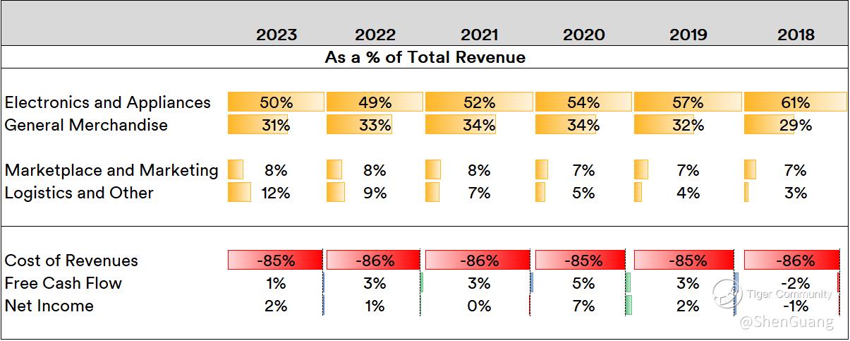 While the company's mainstay has always been the sale of electronics and appliances, the unlocking of logistics solutions very efficiently picked up the eventual slack wrought by intensifying competition. Over the course of six years, cost of revenues maintained a firm ratio while net income and free cash flow showed some fluctuation as the company continued to build out new solutions and facilities for services.