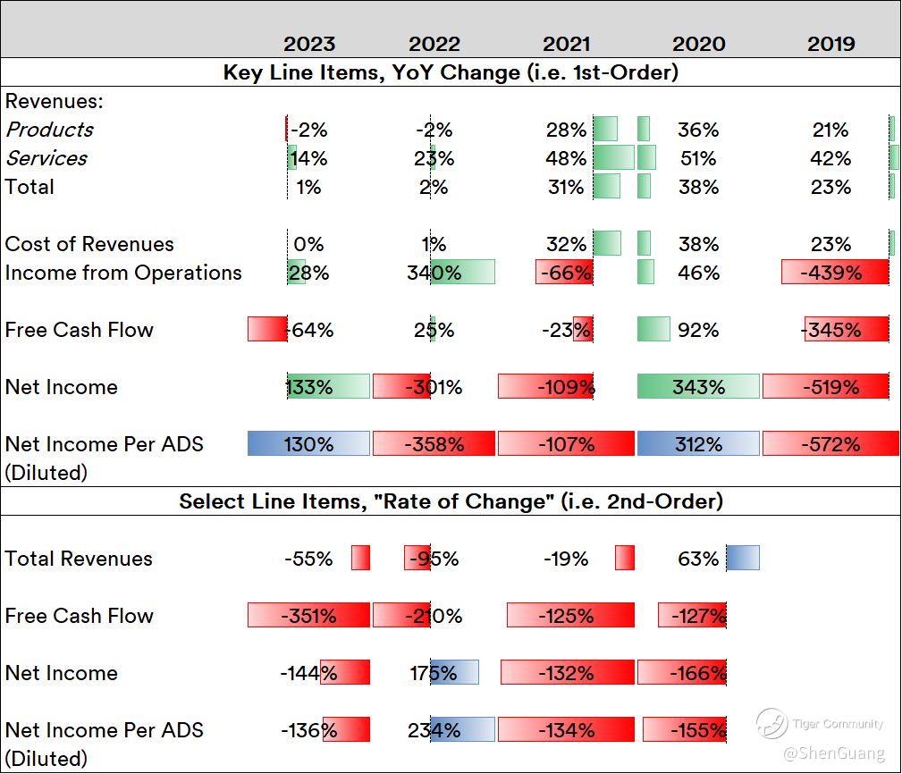 Examining key line items on a first-order (i.e. "year-on-year") basis as well as second-order (i.e. "rate of change") to consider any possible deeper trends yields some further context: