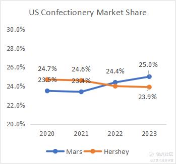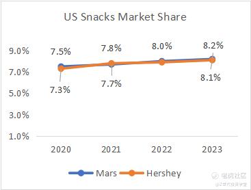 Hershey’s has been growing faster over the past five years and is expected to catch up to Mars' market share. The company has experienced better growth potential than chocolate, with annual sales of savory snacks rising 5-7%, compared to 1-3% for the former.