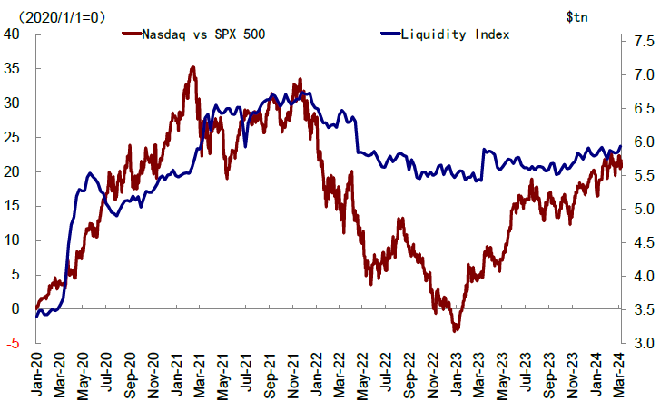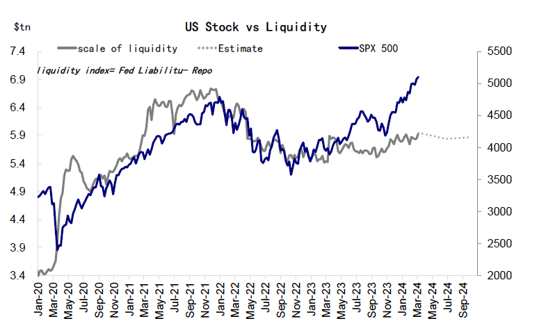 Considering the Treasury's debt issuance plan, the Fed’s table shrinking pace and the monetary policy path, we predict that the financial liquidity index may shrink in the second quarter. The Fed continues to shrink the table and stop using BTFP. This means that the liquidity index will fall.