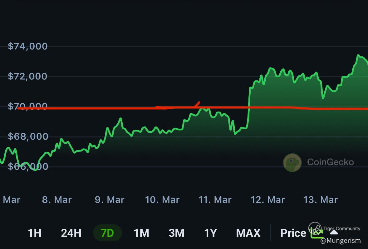 Yesterday BTC had a dip to $69k at the previous all time high and held.This is a strong sign of support by the buyers. Subsequently it drifted back up and hit passed $73k. As long as the support holds, it augurs well for both Coin and MSTR