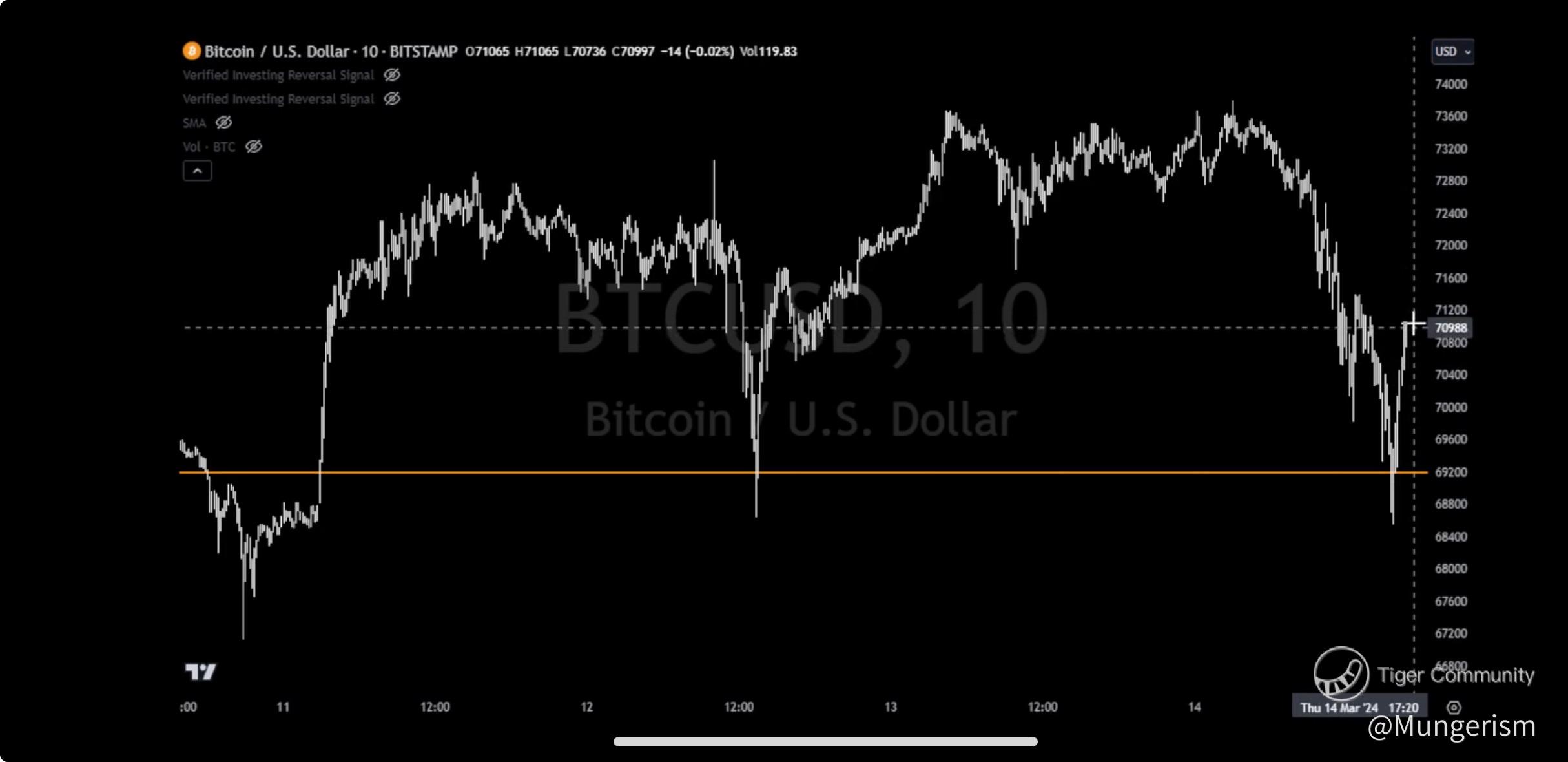 Overnight, BTC was flushed down for a second time in a week but was defended at the previous all time high mark around $69k+ and then rebounded ( see attached chart). For now the bulls have won. It is important that the BTC weekly price close higher than the previous week to keep the bullish momentum. I wonder how strong the defence is given that that the support has been got twice in a few days. For now I'll say it's strong given the strength of the rebound. Obviously this price action will influence the price of COIn and MSTR. Watch BTC price closely over the next few days