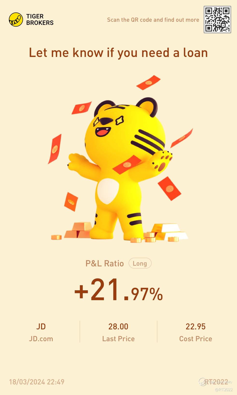 $JD.com(JD)$ JD.com Inc.'s shares notched their biggest gain since 2022 after the e-commerce major reported a better-than-expected 3.6% revenue rise and predicted Beijing will drive a Chinese consumer recovery.