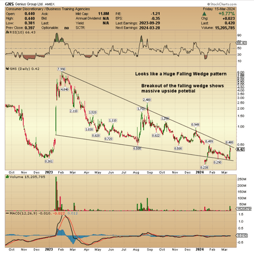$Genius Group Limited(GNS)$ Ready for another week. đĽđĽđĽđĽđĽđŻđ Looking for that Huge Breakout on the falling wedge pattern.