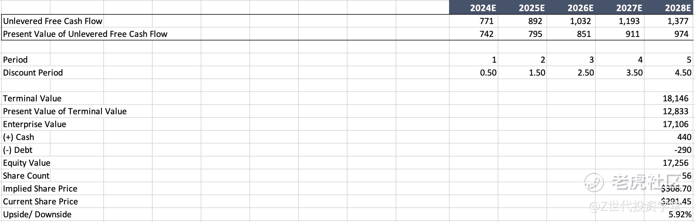 Street estimates for SMCI FY24 Revenue growth is estimated to be 49.7% while tapering down to 26% revenue growth for FY28. With an Enterprise value of 17.106 billion and equity value of 17.256 billion, intrinsic share price of SMCI is $308.70 using a 5-yr DCF.