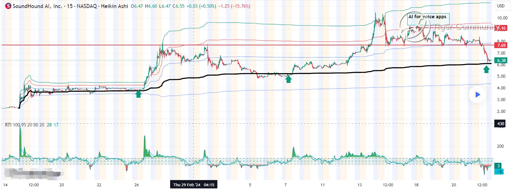 SOUN on the 15 minute chart as fallen again to the anchored mean VWAP. Each previous time this has occurred in the past month, price has bounced into the second or third upper VWAP band line for a bullish momentum move. The mean VWAP is where big players like to pick up and drop off shares. Liquidity is at the highest. Teh Relative Trend Indicator will show best entries where the trend is negative but the returns to the chop zone to climb out of it and go positive. This indicator can function with alerts and notifications. SOUN uses AI and voice control of it to make apps more user friendly and potent. A similiar stock is DuoLingo ( DUOL) which also adds language translation into the functionality. Those on a budget in their trading love the price. Those not on a budget make love the volatility and the quick profits it can bring if traded properly. $SoundHound AI Inc(SOUN)$