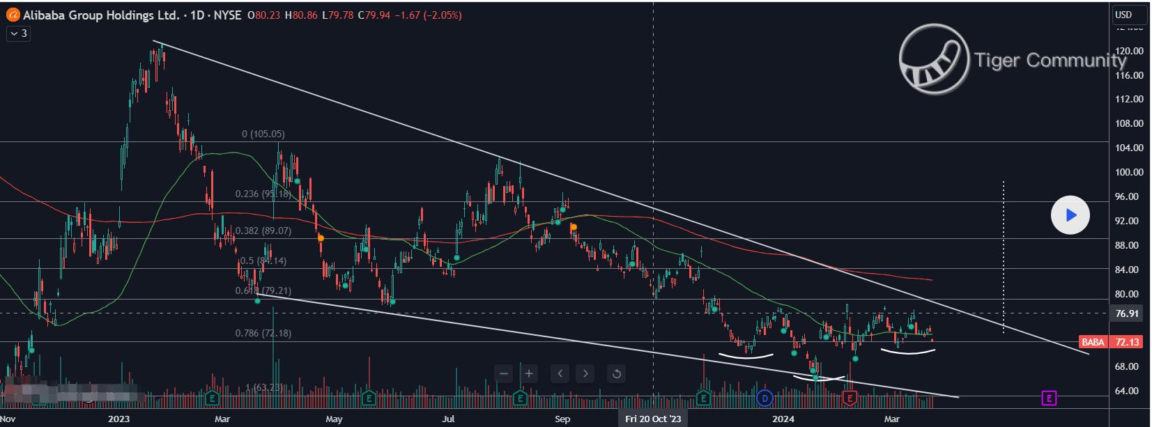 baba is currently trading within a descending wedge pattern and fluctuating within a trading range of $72 to $78.