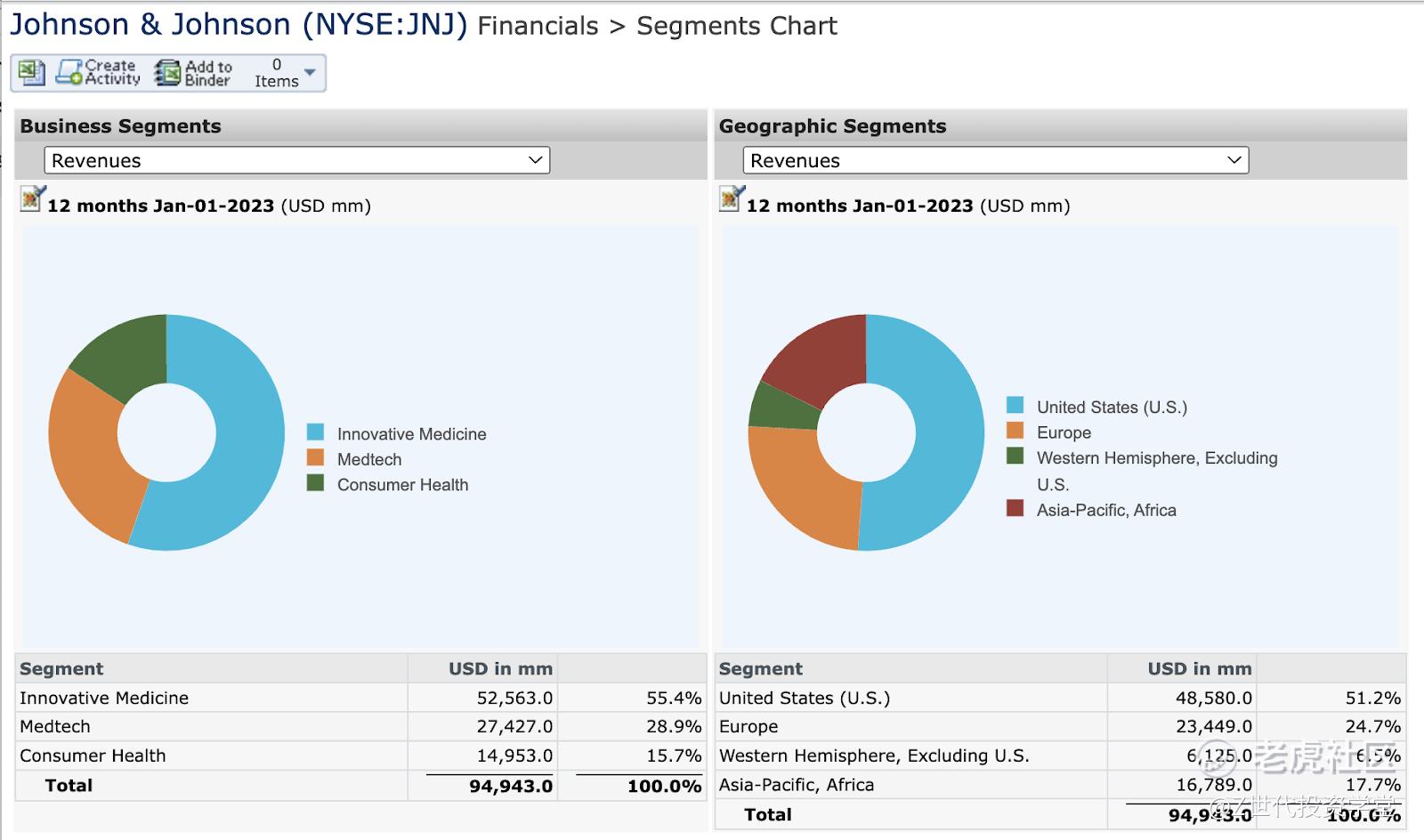 The following chart shows JNJ 2022 revenue by business segments and geographic segments, where the company had about half of its revenue from the United States. As for the revenue breakdown by business segments, slightly more than half was from the Pharmaceutical (Innovative Medicine) business segment, while the Consumer Health segment accounted for only about 15% of total sales.