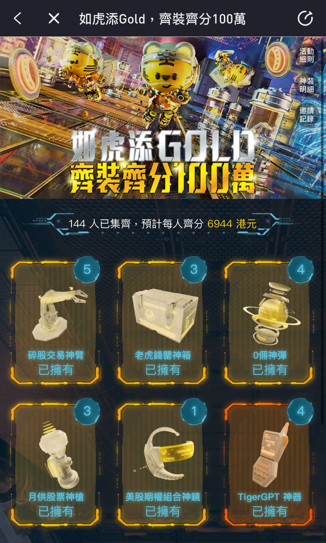 只要儲齊一套 6️⃣ 款「小虎神裝」,就可以瓜分到100萬 🤑,普通神裝有 5️⃣件分別有「碎股交易神臂」、「老虎錢罌神箱」、「0傭神彈」、「月供股票神槍」同「美股期權組合神鏡」,而稀有神裝有 1️⃣ 件,就係「TigerGPT神器」!