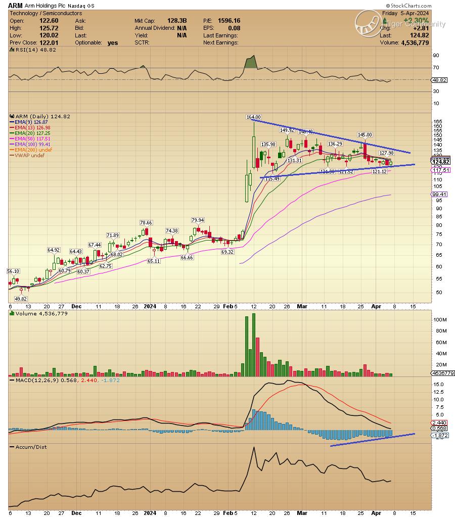 $ARM Holdings Ltd(ARM)$ In terms of price pattern, the stock has formed a large bullish Flag pattern while MACD is displaying a pos divergence. Definitely on watch to see how the stock will trade over the coming weeks. Investing is about future earnings. ARM is best in class chip design. Buy and hold,3-5 yrs. will be rewarded.