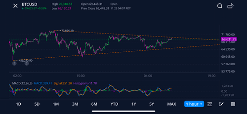 $CleanSpark, Inc.(CLSK)$ it looks like $Bitcoin(BTC.USD.CC)$ could break out here. With CLSK looking like it’s at support, the bottom could be in for CLSK. On the other side if BTC can’t break out here it could go back down to 64kish and that would lead to a little more downside this week. Either way i like the trade.