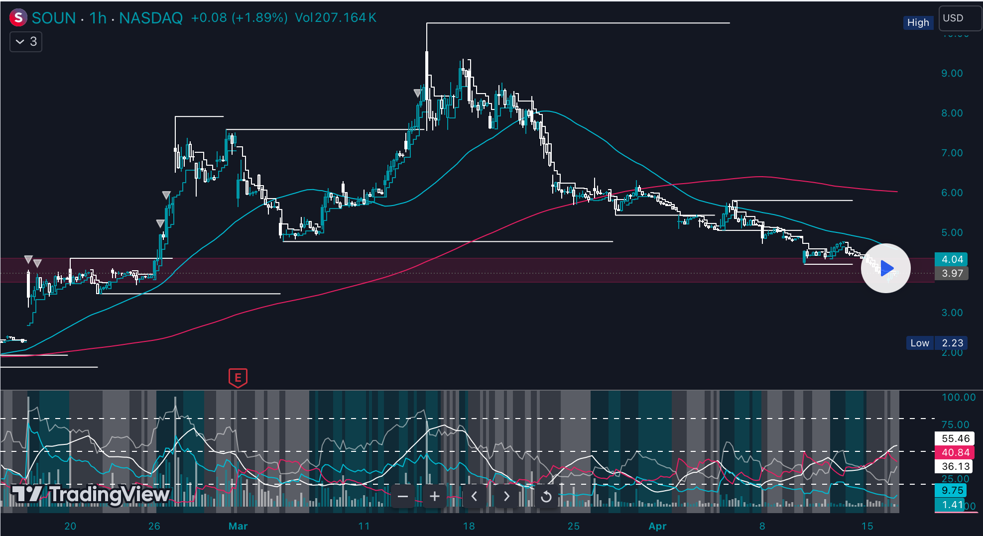 SOUN's rebound from the $3.75 level and the rising RSI suggest potential for a support zone rebound. Traders might consider watching for confirmation signals, especially near the 4hr 200 SMA, for possible bullish opportunities.