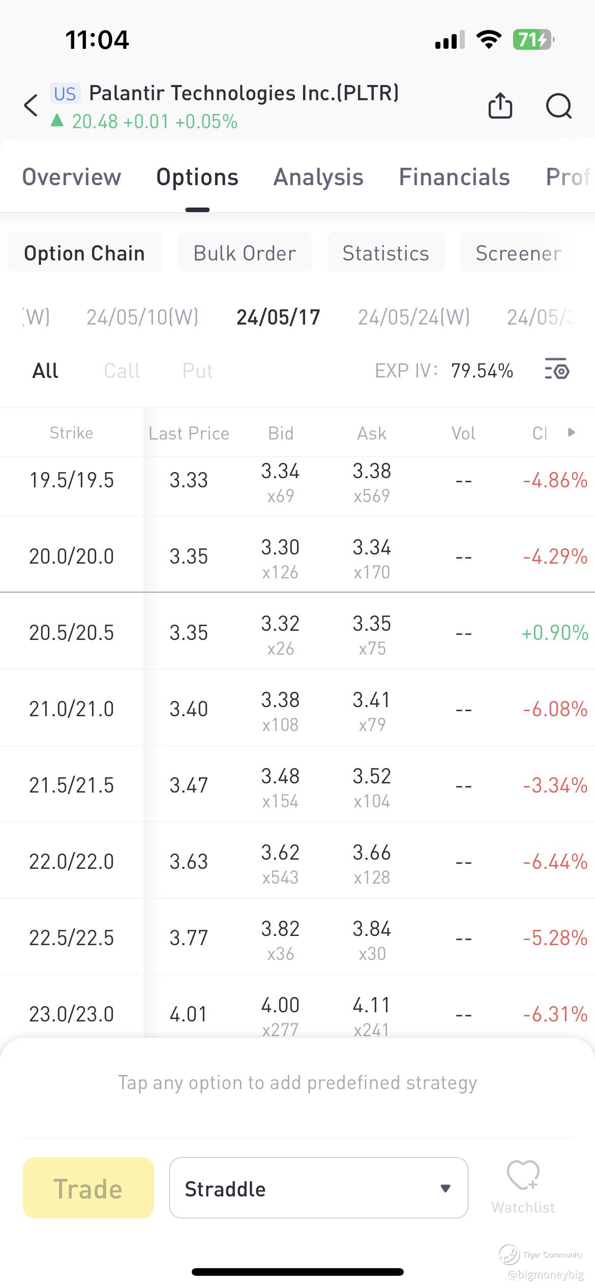 $Palantir Technologies Inc.(PLTR)$ given the track record, straddle at 20.5 might be a good choice. Price movement of $3.35 or more is highly probable