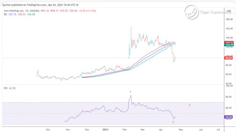 arm tested the gap successfully. Looks safe for the moment. Remember this is a trading vehicle for me. Impossible to make a case for a LT position here with the insane multiples it carries. granting point 2 bottomed then possible v-bottom for a point 3 rally.
