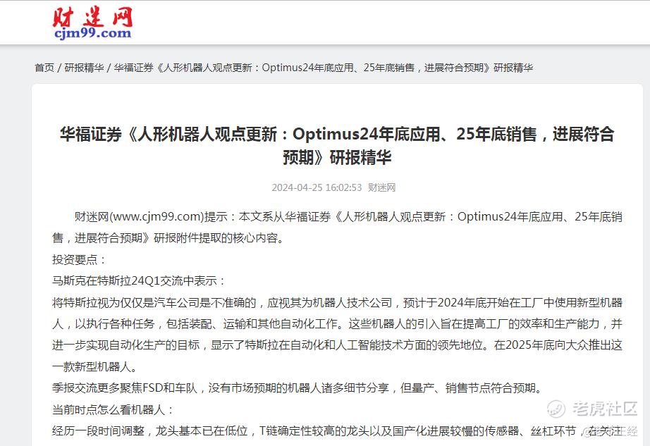 財迷網(www.cjm99.com)提示:本文系從華福證券《人形機器人觀點更新:Optimus24年底應用、25年底銷售,進展符合預期》研報附件提取的核心內容。
