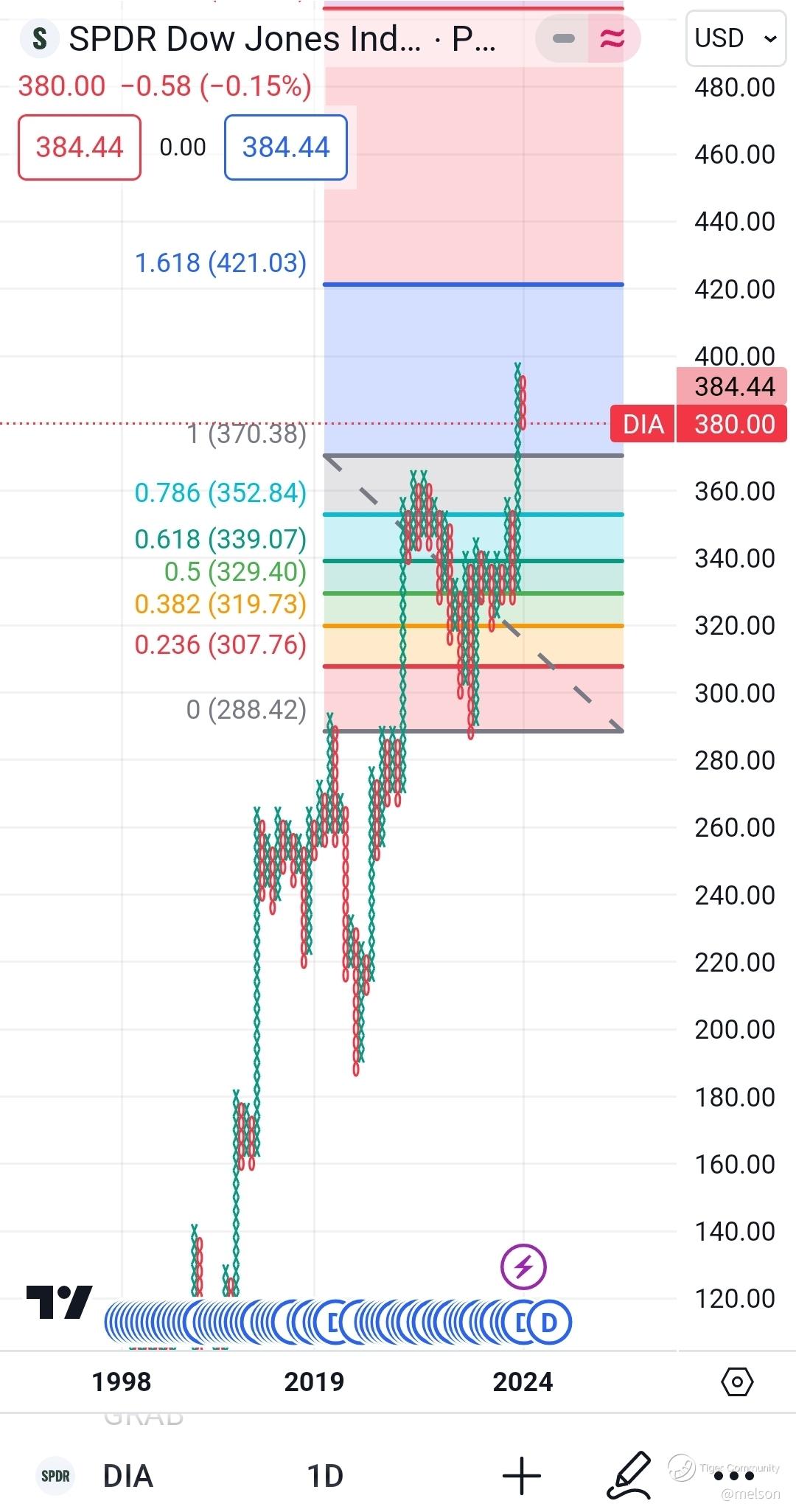 $SPDR DJIA ETF(DIA)$ pnf shows a confirmation of downtrend with red circles. the next support is at 366. dia is an etf that tracks the large caps. usually the market will trend after the large caps.