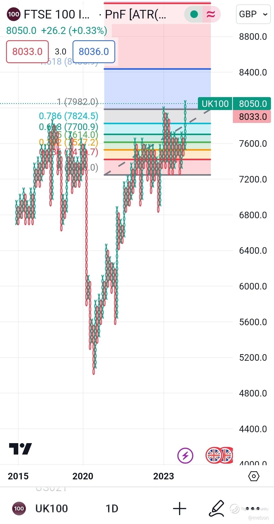 $FTSE 100(.UKX.UK)$ pnf shows a new high. investors will most likely be buying up for fear of missing out. ukx is the leading indicator of the us market. the us market may not follow immediately but may follow after a few months to a year.