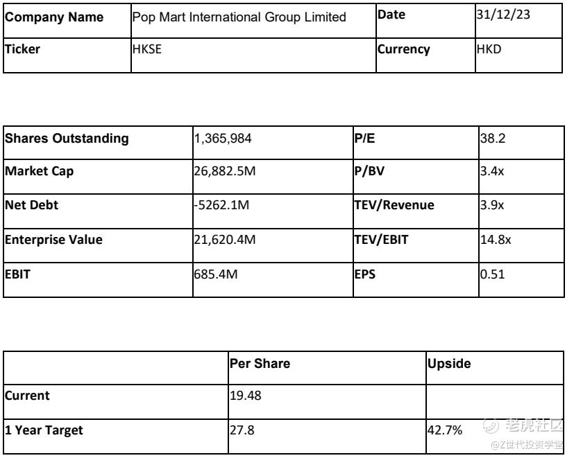 1) Popmart is currently undervalued due to a decline in sales resulting from the economic downturn in the Chinese economy. Given that the majority of Popmart's revenue is derived from Mainland China, the stringent lockdown policies in 2022, along with the unfavorable economic outlook in 2023, have had an adverse impact on the company's top-line growth. The Chinese government implemented a zero-covid lockdown policy, which confined over 11 million residents to their homes. This negatively affected the sales of retail stores, which contribute to 40% of Popmart's revenue, and diminished the effectiveness of marketing efforts, consequently influencing other sources of revenue indirectly. Additionally, the relatively high cost of Popmart's products, coupled with theperception of toys as non-essential items, particularly during economic hardships, has further contributed to the revenue decline.Despite these challenges, Popmart is proactively pursuing geographical diversification by identifying opportunities in other countries that have strong shopping and entertainment cultures, as evident in the opening of new stores in Australia, New Zealand, and the United States. In addition, Popmart has acquired its British partner in June 2023 to further penetrate the Western market. This strategic expansion aims to leverage Popmart's substantial growth, evidenced by a Compound Annual Growth Rate (CAGR) of 140% in markets beyond Mainland China. In addition, Popmart is acquiring Moreover, Popmart is broadening its product offerings to include theme parks and mobile games, providing an immersive experience that brings characters to life and enhances consumer loyalty.