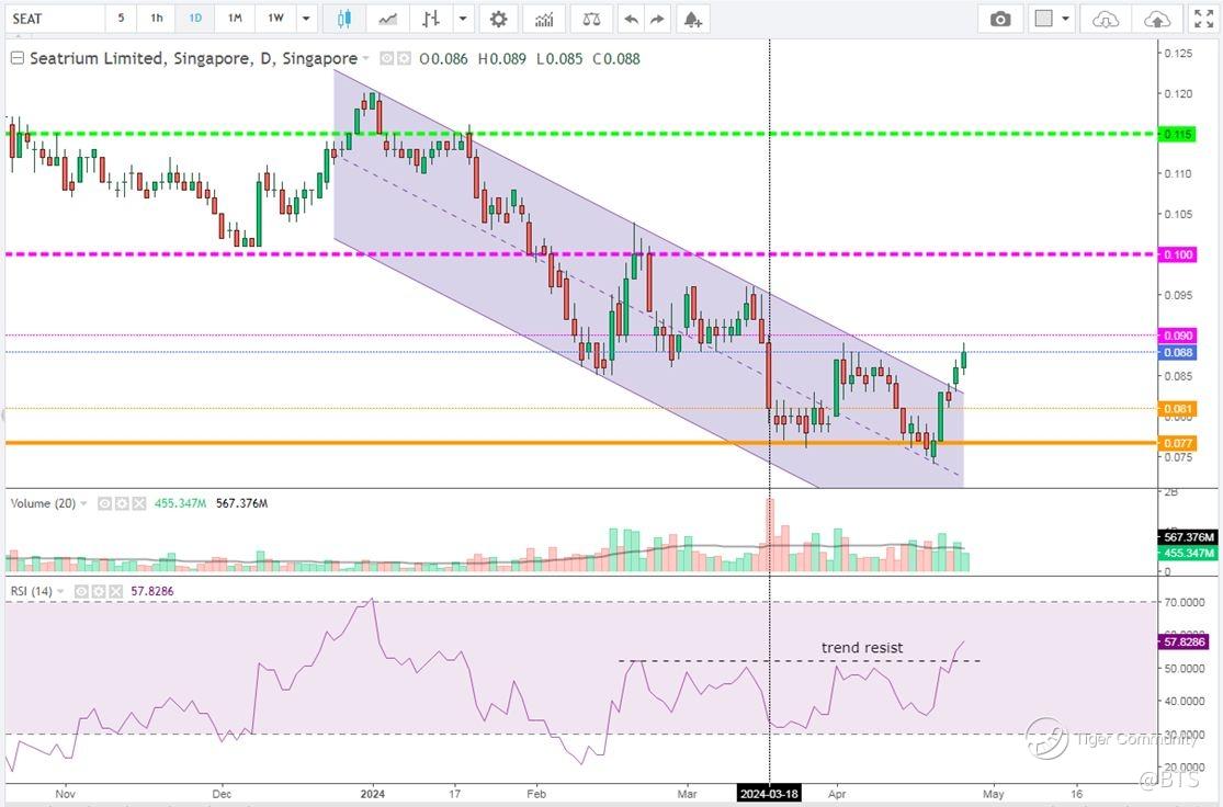 Expect further upside along the upper channel line resistance when volume picks up (about the heavy volume activity level of 18 Mar 2024)