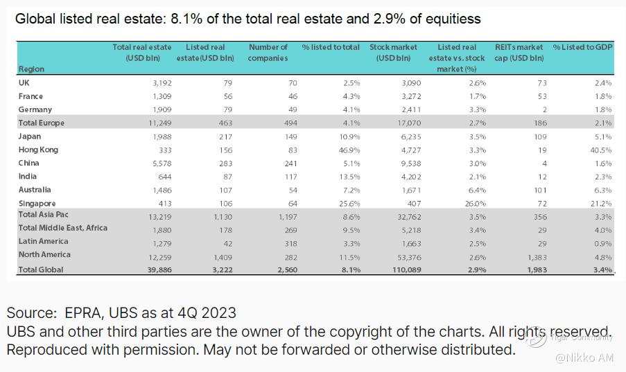 Note: Total real estate (high quality commercial) estimated using 45% of GDP, based on a formula devised by Prudential Real Estate Investors, as published in “A Birds Eye View of Global Real Estate Markets.” In developing countries, the figure is lower. Listed Real Estate is that portion held via a listed form.