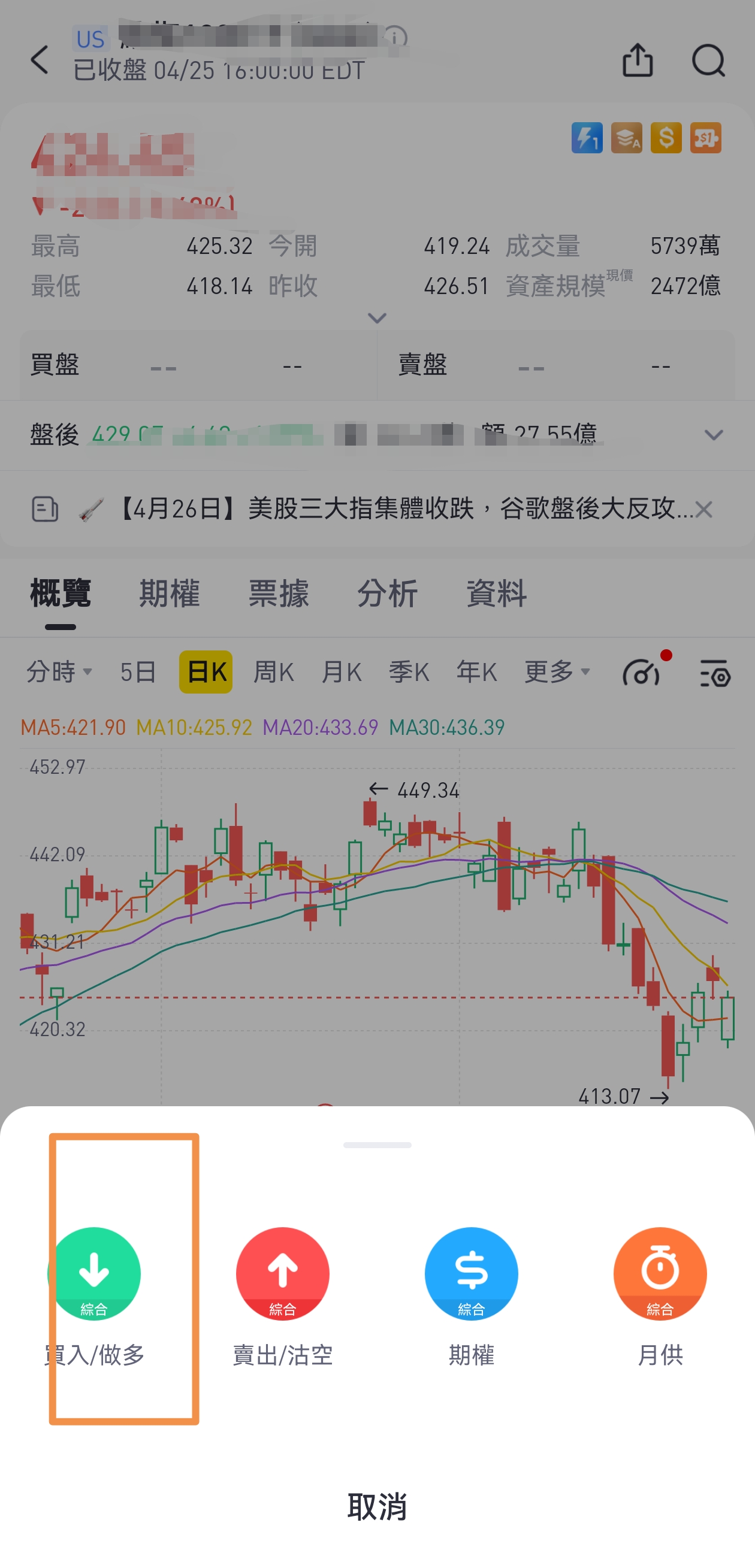 B.輸入你想申購的ETF代碼,點擊“交易”,點擊“買入/做多”。