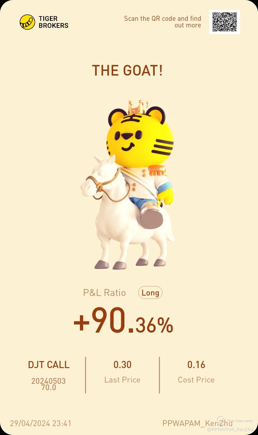 After making mistake for previous option, now waiting to close for taking profit[Miser] $DJT 20240503 70.0 CALL$ I will not be as greedy as before. Once gain between 50 to 100% will take profit. Unless otherwise[Chuckle]