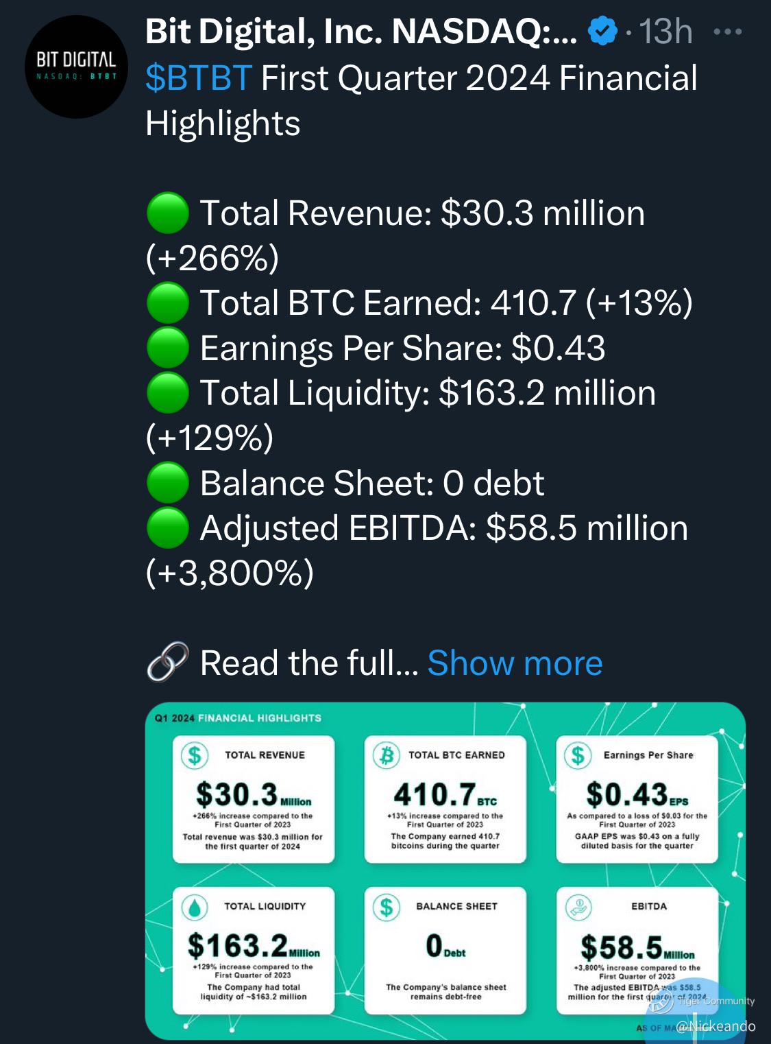 $Bit Digital, Inc.(BTBT)$ Very good earnings Q1 2024.