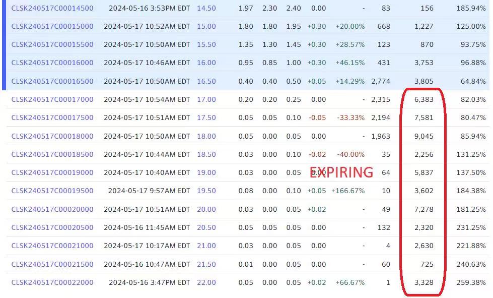 $CleanSpark, Inc.(CLSK)$ There is a lot of open interest looking to expire at $17+. I wouldn't be surprised to see it close below $17 today to wipe out all these calls. It's a tough market for options, I don't recommend you play in them if you don't know what you're doing. Buy common shares, DCA, hold. It's a better strategy. GL bulls.