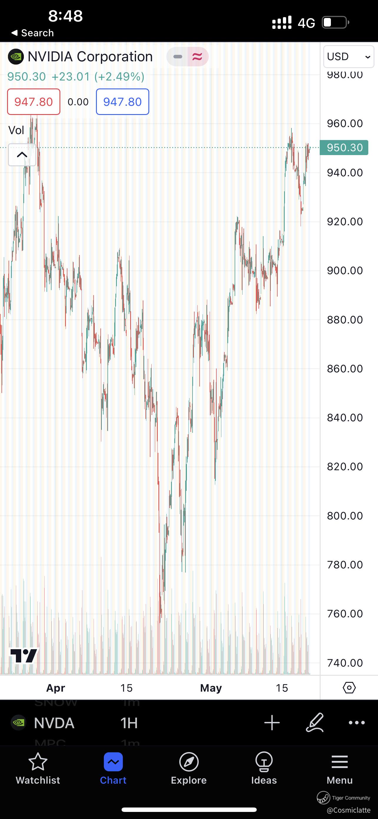 The $NVIDIA Corp(NVDA)$ story continues to push up the entire bull landscape out there. There are many who will want to own this giant in their Portfolio hence it will be a buy on dips kind of scenario with the upcoming earnings release. My calculated intrinsic value of this stock is $740 but given the hype with chips it might be hard to get there again. Given it's an expensive stock, I'll prefer to take an option trade vertical to buy a bull call 1100/1110 spread value 21 June that cost me only $1.50 per contract but the rewards can be as high as $3.