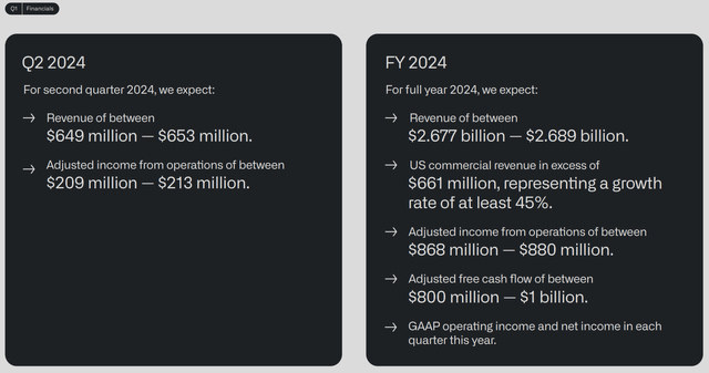 Palantir Technologies' (NYSE:PLTR) stock price dropped after its Q1 2024 earnings were announced. Interestingly, it was not the earnings themselves that startled investors. Instead, their less-than-expected guidance for Q2 caused the stock to drop by up to 10% on the following trading day. To us, this reaction seems a bit exaggerated. In fact, Palantir raised its outlook for the full year and crossed the $100M net income mark for the first time during Q1.